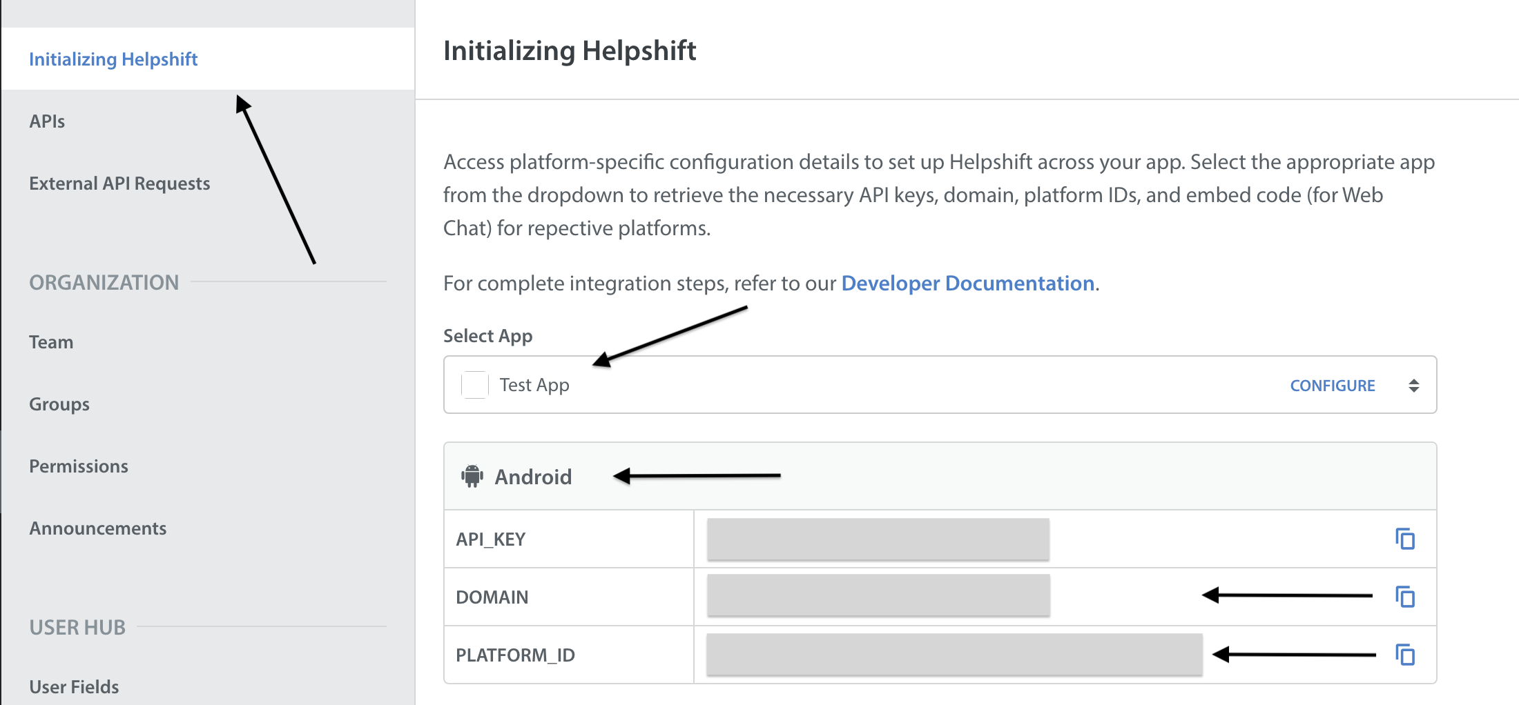 You can find these by navigating to Settings>SDKs (for Developers) in your agent dashboard. Select your App and check Android and iOS as a platform from the dropdowns and copy the 2 tokens to be passed when initializing Helpshift.